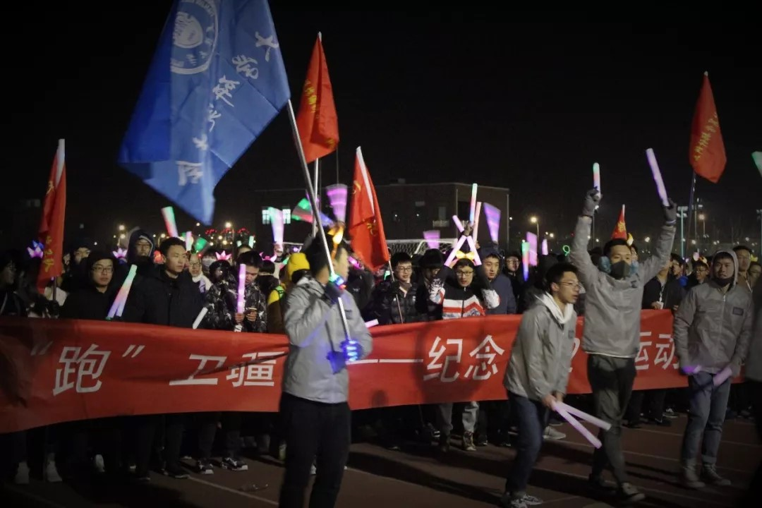 经过系统的热身运动后,七点四十分荧光夜跑正式开跑。本次荧光夜跑活动以体育场为起点,途径博文北路、博文中路、明德南道等街道,最终回到体育场。队伍浩荡宛如一条腾飞的巨龙,荧光闪闪好似无垠星驰。寒冷的天气阻挡不了同学们的爱国热情和运动激情,看似漫长的路线也在彼此欢声笑语、携手同行中到达了胜利的终点。夜跑结束后,全体参与者在工作人员带领下到足球场中心有序排列,按指挥站成“TJU”的图案。“恰同学少年,风华正茂,书生意气,挥斥方遒。”此时的北洋学子用激情点燃青春,用夜跑的方式向前辈致敬。