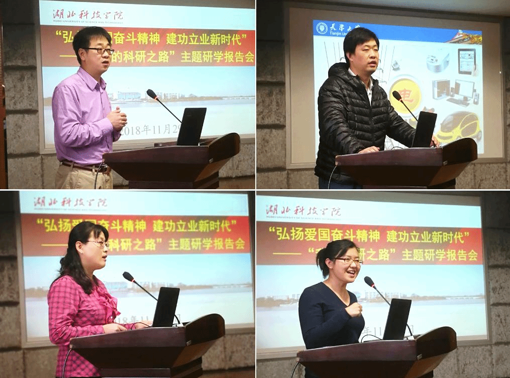 应学院邀请特别安排的“我的科研之路”研学主题报告会上,学校微电子学院刘昱、自动化学院杨挺、数学学院郭飞、环境学院刘佳等四位青年专家分享了自己在教学科研工作中的成功经验,讲述了以“家国情怀”为己任的天大人的奋斗故事,精彩的报告激起湖北科技学院师生的热烈反响。