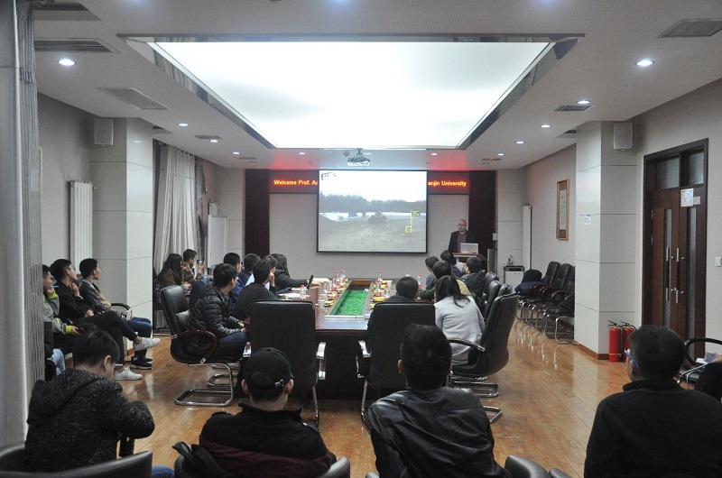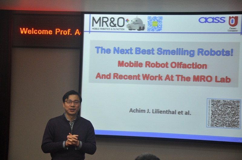 机器人与自主系统研究所所长孟庆浩教授主持研讨会。孟教授在致辞中欢迎Lilienthal教授等专家到访天津大学进行学术交流,简要介绍了机器人与自主系统研究所的基本情况、研究方向及科研成果。随后,Lilienthal教授在研讨会上作了长达2小时的精彩主题报告。Lilienthal教授首先从“研究机器人嗅觉的意义”、“移动机器人嗅觉的研究现状”,“移动机器人嗅觉的研究挑战”三方面全方位介绍了移动机器人嗅觉,接着重点介绍了其团队在机器人嗅觉方面的研究工作和取得的代表性成果。