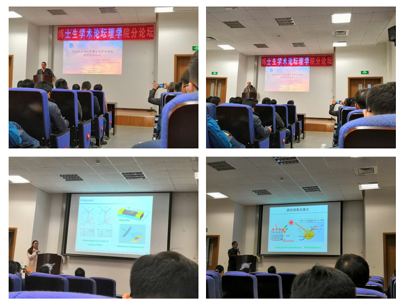 开幕式后,物理系博士生国家奖学金获得者2016级博士生殷励做了题为《BIXO3/BiFeO3多铁超晶格中可控的能谷极化和自旋极化》的大会报告,多铁异质结中能谷结构的产生、设计及调控。随后,化学系博士生国家奖学金获得者孟楠楠作了题为《含氧基团与氨基共修饰的超薄多孔碳化氮光催化产氢》的主题报告,以精彩的报告呈现了其在提高光催化产氢效率的道路上的探索。报告期间,两位同学细致回答了在座老师与同学的提问。