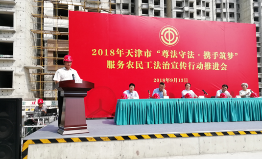 本站讯(通讯员 温锌勇 摄影 赵洋)9月13日,天津大学校工会组织师生代表来到天津市南开区芳庭雅苑项目工地,参加了天津市“尊法守法·携手筑梦”服务农民工法治宣传行动推进会,法学院教授吕凯作为高校法治宣传服务队代表在会上发言。