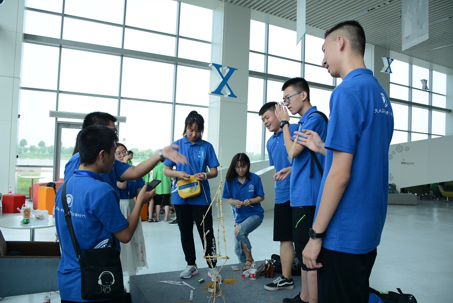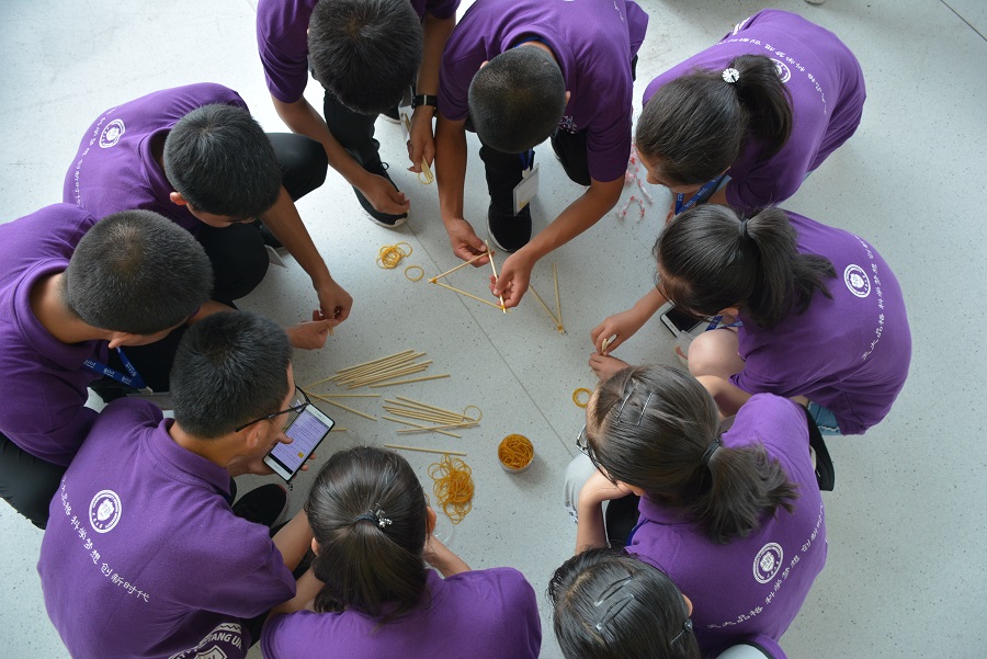 随后,营员在小班的带领下来到大通学生活动中心众创空间进行“搭筷子”比赛。即利用一定数目的一次性筷子和若干橡皮筋搭建“筷子塔”。小营员们以十人左右为一组,在一个小时内利用有限的材料完成搭建,最终在自然状态下测量“筷子塔”的高度以决胜负。营员们在比赛中充分发挥空间想象能力与团队协作精神,坚持不懈地突破了重重障碍,最终均成功地完成了比赛。此次创新实践不仅锻炼营员们的想象力与动手能力,更培养了他们的团队配合能力。实践结束后,营员们纷纷与自己的作品进行了合影。