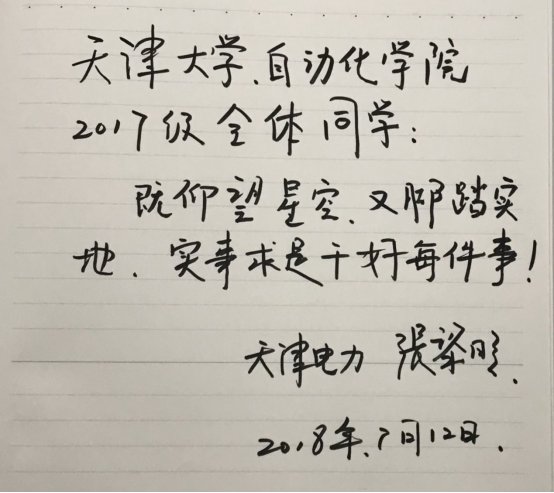 张黎明同志还结合天津大学校训“实事求是”,给自动化学院2017级全体学生写下了“既仰望星空,又脚踏实地,实事求是干好每件事”的手迹,蕴含着鼓励同学们踏实学习好专业知识,未来报效祖国的祝愿。