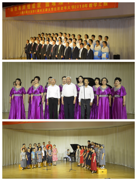 2016年12月份,天津大学北洋老年大学正式成立,目前已开设14门课程,共计26个教学班,累计1200余名老同志加入老年大学。老同志学员们怀抱着终身学习的理念和满腔热情投身到老年大学的学习中,在丰富自身精神文化生活的同时,积极为党和人民的事业增添正能量。在这场汇报演出中,老同志学员们有的虽已白发苍苍、年逾花甲,却有着一份高涨热情,不顾酷暑高温,认真参与筹备与排练,凭着一股“活到老,学到老”的劲头与热情,最终精心为我们呈现出一场有声有色的完整演出。