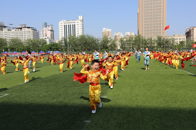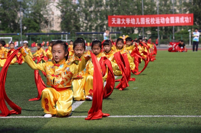 迎着朝阳,手持红绸,伴随着音乐声的响起,孩子们一路呐喊着奔跑着闪亮登场,英姿飒爽的动作,稚嫩又不失整齐的步伐,跟随节奏变化的队形,充分展示了天津大学幼儿园积极向上、团结一心的大园风采和高水平的师资队伍和办园特点。