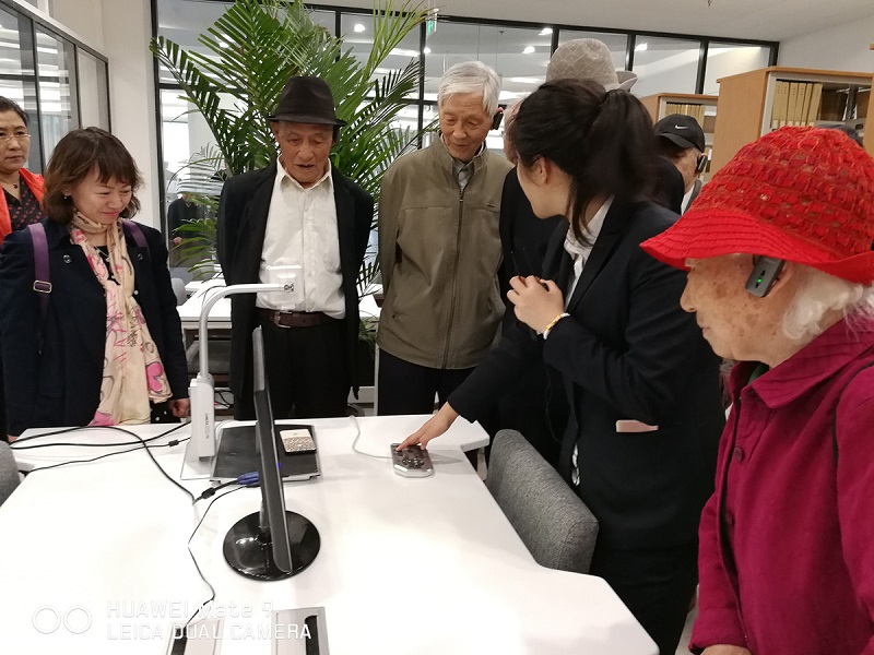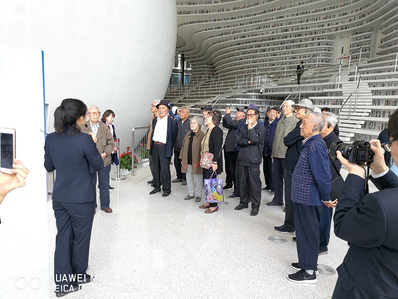 接着,老同志们又来到滨海新区文化中心,参观了新建成的有着“中国最美图书馆”之誉的滨海新区文化中心图书馆。一进门,老同志们就被图书馆科幻感十足的“颜值”所震撼,在有着“书山”造型的中庭纷纷拍照留念。跟随工作人员的引领和讲解,老同志们浏览了图书馆的主体空间,尤其在老年人和视障阅览区,切身感受了自助注册、借还、信息检索的智慧服务。几位老同志曾多年在校图书馆工作,感慨万分地说:“跟我们那时候比起来,可是大不一样了!”
