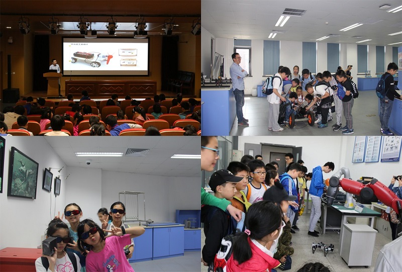 在实验室志愿者的指引下,小学生们队列整齐的走进机械工程学院宏远报告厅,聆听了关于“妙手”手术机器人、“海燕”水下机器人、并联机构、工业设计、折纸和折展机构等专题报告。学生们分批参观了变胞机构、折展机构、并联机床、微纳加工等实验室。参观过程中,各实验室负责人分别详细的介绍了实验室特点,并进行了现场展示。神奇的变胞机构机器人引发了学生们强烈的兴趣,久久不愿离开,折展机器人的展示更是引来连连惊叹声。在并联机床,微纳加工实验室的参观,学生们分别参观了大型机床和纳米平台,领略了不同尺度的神奇机构。现场参观气氛热烈,充分激发了小学生的好奇心,各种奇妙提问也频出不穷。参观结束后,实验室向每个小学生准备了一份神秘礼物,礼物的发放将现场气氛推向高潮,小学生们都无比兴奋。