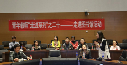 互动座谈会环节中,孟少卿对走进图书馆的青年教师表示热烈欢迎,并与大家就图书馆的未来发展进行了沟通与探讨,他阐述了现代高校图书馆的功能由纸质藏书与借阅逐步向信息交流与共享空间发展的趋势,强调了图书馆为学生提供多元化素质教育平台的作用。负责图书馆资源建设工作的馆员韩鹏鸣介绍了近些年图书馆中西文数据库的采购与利用情况;负责信息情报服务工作的馆员田爱萍介绍了图书馆科技查新、查新查引、课题组情报服务等业务情况。针对教师们提出的关于图书查找、借阅权限、学位论文管理、数据库使用等问题,图书馆工作人员现场为青年老师进行了详细解答与说明。