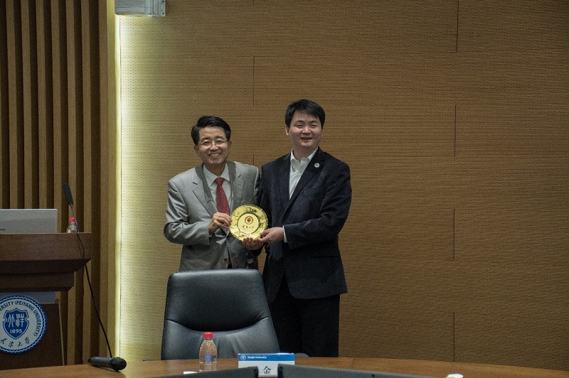 报告结束后,巩金龙教授向Taeghwan Hyeon教授颁发天津大学北洋园大讲堂纪念牌与致谢证书。Taeghwan Hyeon教授和参加讲座的部分老师合影留念。