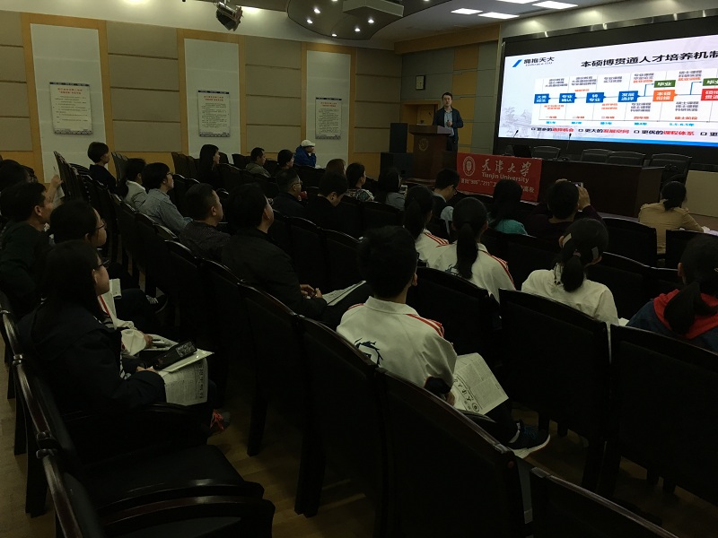 在杭州二中,张宇为到场的高三学生与部分学生家长进行天津大学专题招生政策的宣讲,内容包括“印象天大”、“拥抱天大”和“2018年浙江招生政策”三个部分。他通过列举天津大学近年来的标志性科研成果“海燕”深海机器人、人类首次太空脑机交互实验、国产大飞机环境控制等,加深了大家对于天津大学的认知和了解。张宇讲述了天津大学在当前新工科建设浪潮中所取得的卓越成就,包括联手腾讯率先启动新工科人才培养模式探索、获批创办全国首个智能方向医学类本科专业、在教育部“新工科”立项数名列全国第一等。他以精仪学院工程科学实验班为例,展示了工程教育通识课程体系和以学生为中心的教育模式所取得的积极成效。他详细地向在场的学生和家长们介绍了天津大学近年来在浙江的招生情况和2018年天大招生政策的变化,重点讲解了天津大学的大类招生选拔机制和本硕博贯通的人才培养机制,鼓励优秀高中生报考天津大学相关专业。