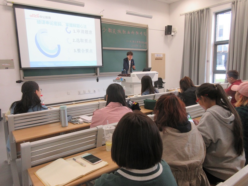 课上,授课老师首先为同学们分析解答了近年来新疆维吾尔自治区政府机关招录的情况,针对来自于不同地区的同学分别给出了中肯的报考建议,而后又对报考的流程和注意事项进行了详细说明。针对西藏地区政府机关招录政策的区域特性,授课老师对有意赴西藏地区就业的学生耐心讲解了当地就业的各项政策,并通过列举申论写作案例,使同学们对备考有了更真切的认识。课后,同学们对自身所存在的疑惑向授课老师进行了询问交流。