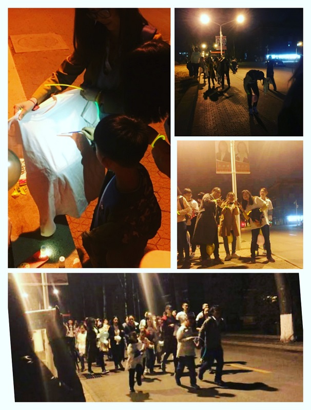 参与者们集聚太雷广场,由节能委员会的领跑者带领,绕校园慢跑2公里。抵达终点学二食堂后,进行了下一场绿色轰趴环节。轰趴上游戏包括了节能问答、托球接力、跋山涉水、奇怪姿态等等。本环节调动了大家的积极性,现场气氛热烈,情绪高涨。在郑东图书馆,在当晚8点至9点熄灯一小时,让大家在一片深沉夜幕中注意到我们头顶的那片星空。