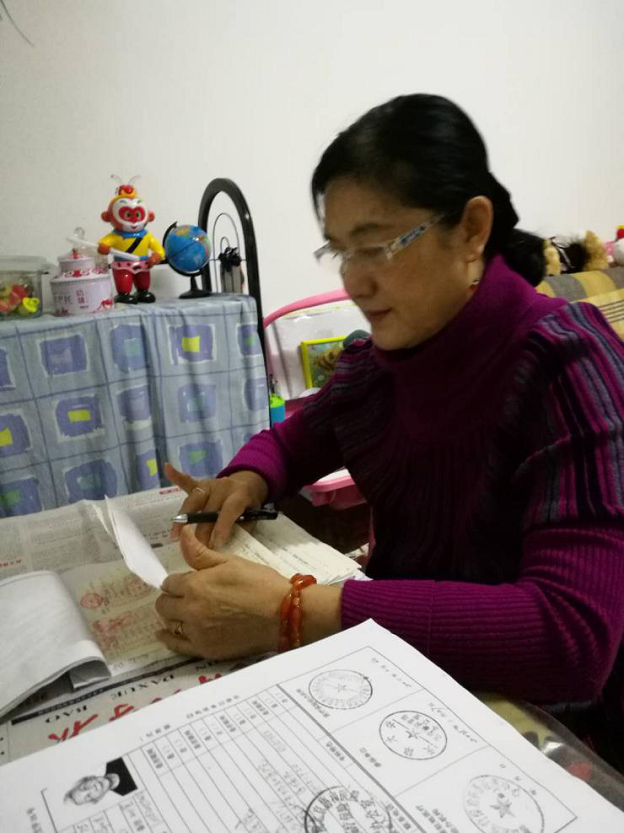 为老服务中心退休教职工商业补充医疗保险报销代办服务负责人翟秀琴在整理票据