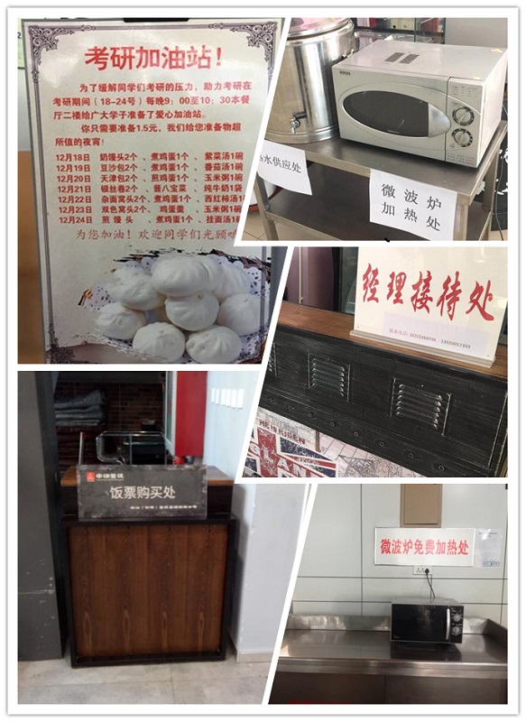 卫津路校区所有食堂就餐时间都在大厅布置保温桶免费提供热水,提供饭票保障外来考试学生就餐,加强保温措施确保饭菜温度,加强值班和巡视工作,遇到问题及时处理。食堂中午不关门,为考生提供休息场所。学三食堂、学五食堂也相应地延长营业时间。北洋园校区食堂管理办公室在自营食堂推出考生“加油”餐,助力备战考生补充能量,每天的食谱都有变化,保证就餐多样性。