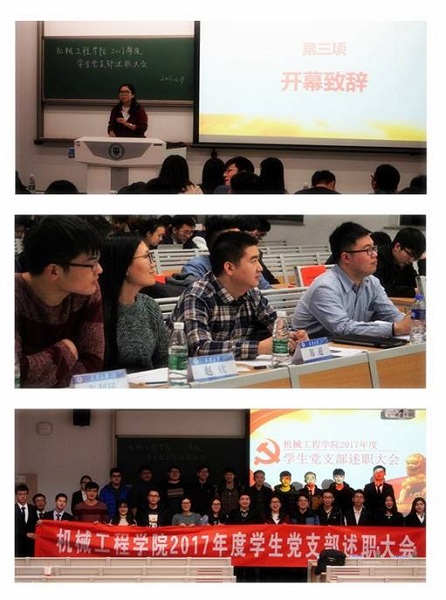 本站讯(通讯员 孙明辉)为深入学习宣传贯彻党的十九大精神,推动全面从严治党向基层延伸,创建“五好党支部”,营造“以评促建、比学互看”的良好氛围,机械工程学院于12月19日晚在46楼A202举行2017年度学生党支部述职大会。学院学生工作办公室全体辅导员出席活动并担任评委,本硕博各年级学生党支部书记、支部委员、部分党员代表参加了活动。
