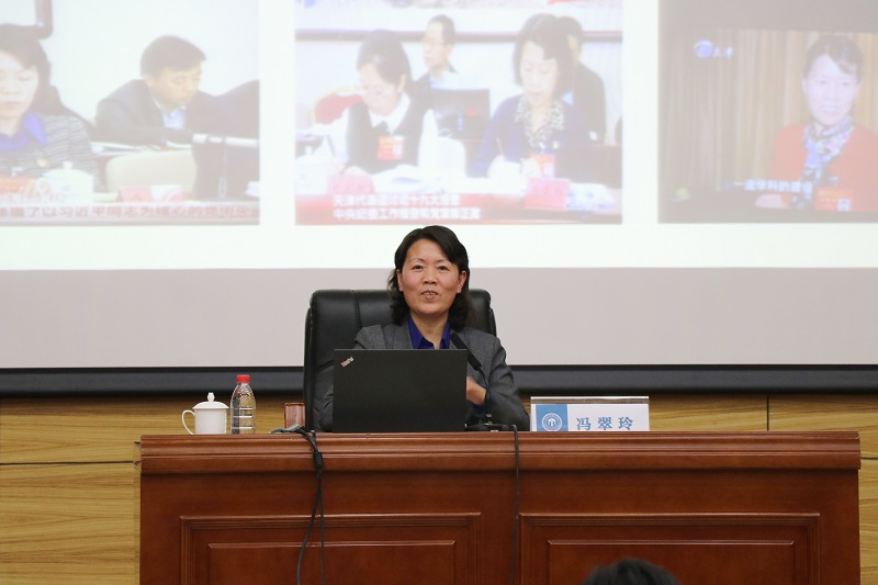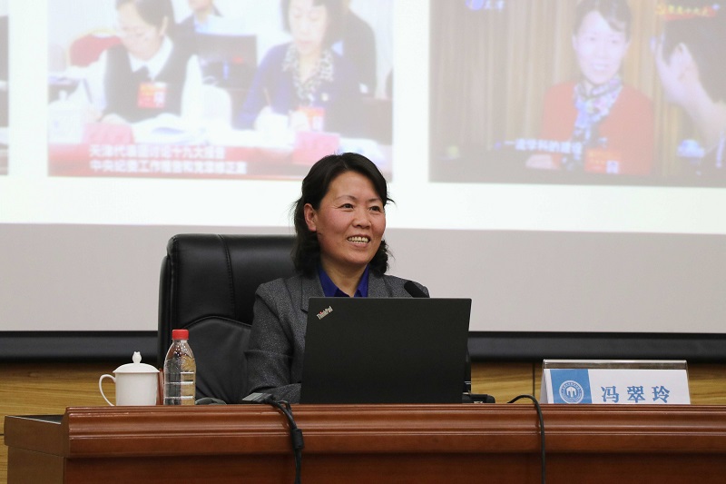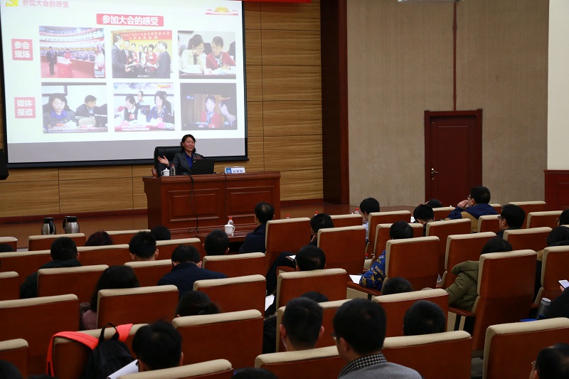 无论是对十九大精神的深入阐释,还是对报告的详尽解读,冯翠玲总是娓娓道来,真诚恳切,句句洋溢着骄傲与自豪。冯翠玲从大会的基本情况、参加大会的感受和大会的主要精神三个部分进行介绍,梳理了习近平总书记的报告,全面解读十九大精神,为学院师生学习贯彻十九大精神提供了指导方向和科学方法论。