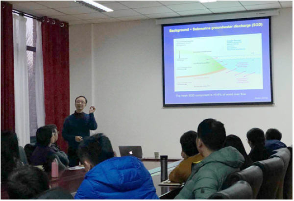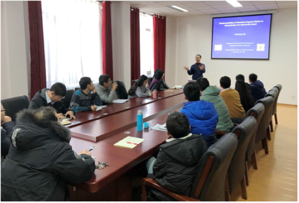 谢会祥教授从自然水体的光吸收原理以及水体中有色溶解有机物(CDOM)的光谱特征谈起,深入浅出地为大家讲解了加拿大亚北极岛地下水的光化学性质、源汇问题。同时,谢会祥教授提出了古土壤层的概念,并阐述了其对入海地下水DOM的影响。谢教授指出地下水中DOM在海岸带陆海之间的再循环系统与海平面上升、气候变暖息息相关,其研究对于全球碳循环以及气候变化具有重要的意义。谢会祥教授的学术报告让参会师生对全球碳循环有了进一步的认识,为今后的学习与如何开展研究提供了更多信息和思路。