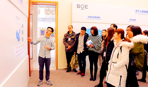 参观过程中,京东方光电科技有限公司人力资源部贺易向大家详细介绍了京东方的成长与发展历程以及京东方的企业文化。大家参观了生产走廊,实地了解TFT-LCD技术和由玻璃到液晶面板的生产过程,还参观了京东方集团展厅,了解了京东方TFT-LCD、AMOLED、微显示和传感器等方向的最新科技产品。京东方现代化的生产过程和柔性屏等高科技产品都给师生们留下了深刻的印象。