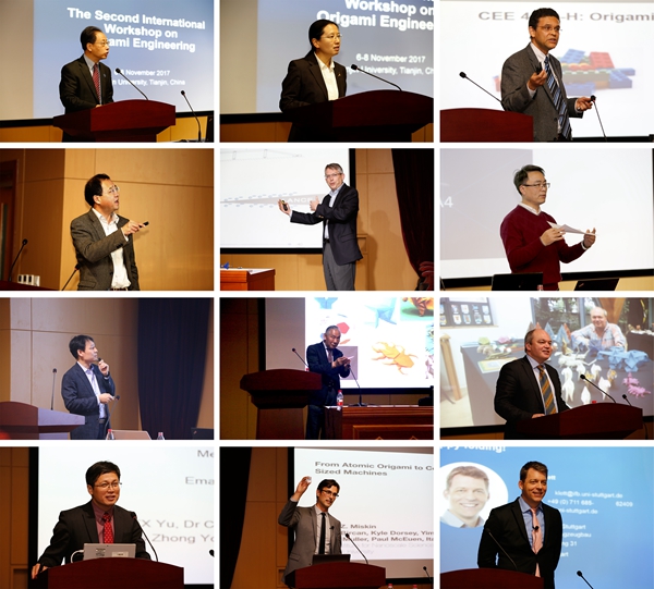 本站讯 11月6日至11月8日,第二届国际折纸工程研讨会在天津大学北洋园校区第37教学楼宏远报告厅召开。来自中国、美国、英国、德国、澳大利亚、日本和韩国的11位国际折纸工程领域专家分别从艺术、数学、物理、力学、机构学、机械工程、土木工程、超材料等方面的折纸研究进行了精彩的专题报告。本次研讨会吸引了来自清华大学、上海交通大学、西安交通大学等国内外30个科研单位约150名相关研究机构人员的参与和研讨,从而推动这一国际新兴学科的前沿发展。