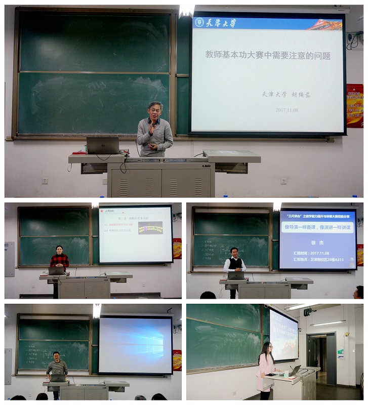 天津市教学竞赛工科组第一名获得者杨佳佳为老师们带来示范课,为参赛选手们提供了直观真切的示范和指导。徐杰以《像导演一样备课,像演讲一样讲课》为题分享了如何备课和讲解的经验和体会,幽默的语言和巧妙的实例引激发了老师们的极大兴趣。张强分享了自己在教学上不断成长的过程和参加天津市教学基本功竞赛的收获和体会,他对教学工作的热爱和执着以及孜孜不倦的钻研引起了在场老师的共鸣。