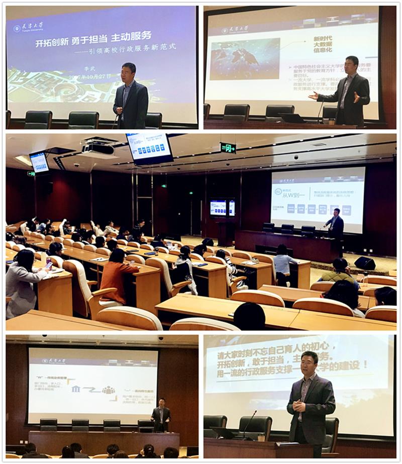 会上,李武结合具体案例,分别从“不忘初心,全员育人”、“天津大学行政服务发展探索”、“基于‘需求视角’和‘问题导向’的行政服务新范式”、“‘互联网+’行政服务的设计和应用”以及“创新 担当 服务——推动者、改革者和收益者”五个方面与机关管理干部做了全面而深入地交流。