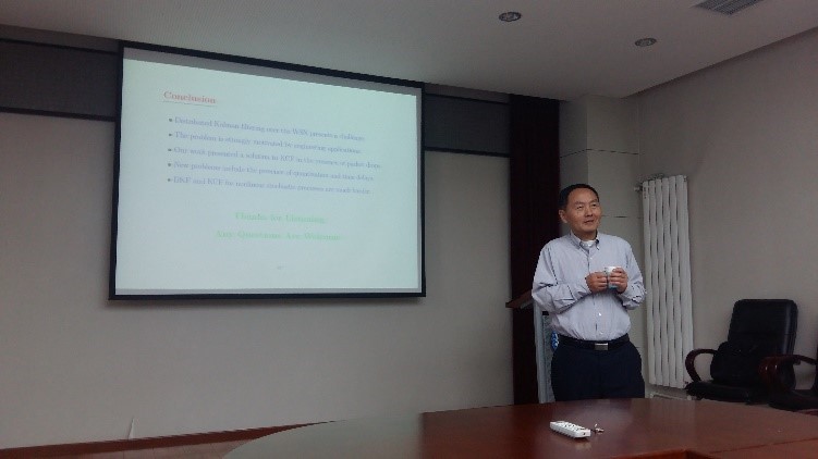 本站讯 (通讯员 辛爽)10月16日,应天津大学电气自动化与信息工程学院邀请,美国路易斯安那州立大学顾国祥教授来天津大学访问,并在自动化学院报告厅做了题为“Kalman Consensus Filtering in the Presence of Data Packet Drops”的学术报告。自动化学院自动化系主任左志强教授主持报告会,约60余名师生听取了报告,并与顾国祥教授就卡尔曼滤波相关内容进行了深入交流。