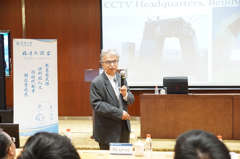 仪式后,Hojjat Adeli 教授做了题为 《Intelligent Infrastructure for Sustainable Design” 》(永续设计理念下的智能结构)的主题报告,他从可持续设计理念,优化技术,半主动震动控制系统,结构健康监测技术等几个部分系统地介绍了通过智能结构来实现可持续设计这一理念。他首先提出了高层建筑全生命周期可持续设计概念,并通过对世界各地知名标志性高层建筑的介绍,引出了高层建筑结构优化的重要性,其目标是要实现复杂设计过程自动化、结构性能优化以及建造成本的最小化。他还重点介绍了一种采用同步压缩小波变换及分形维数对智能高层建筑结构损伤程度进行监测、定位及量化的新方法,以及另一种用于识别大型结构模态参数的方法,该方法综合采用MUSIC、经验小波变换及希尔伯特变换技术。这些方法及模型是先进信号处理技术的巧妙集成,并成功应用于许多大厦楼宇。