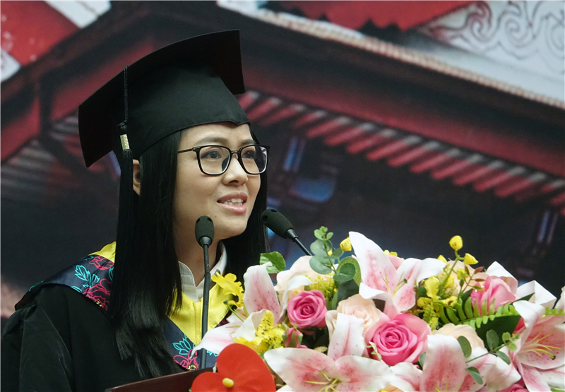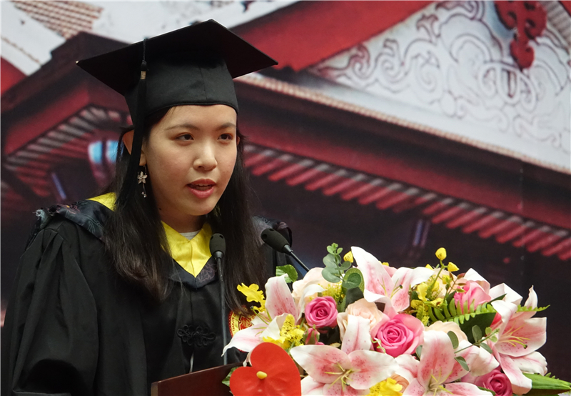 计算机学院2017届留学生、来自印度尼西亚的傅敏明上台发言。她回顾了在天津大学学习和生活的美好记忆,并用流利的中文分别向母校、老师、同学、家人表达了感激之情。“四年大学时光教会了我们很多。在这四年里,让我们从中国的客人,变成了主人。”她还表示在天大认识了很多中国的朋友。“虽然我们的国籍,文化,还有习惯不一样,但是这并不能阻挡我们的友谊。”傅敏明说。