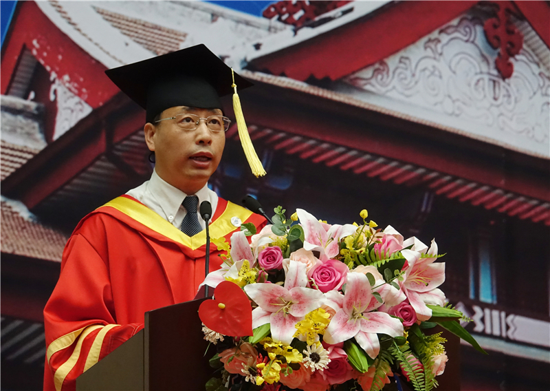 中国工程院院士、天津大学校长钟登华在毕业典礼上作了题为《勇于担当 放飞梦想》的讲话。他首先代表全体师生和校友向毕业生们表示衷心的祝贺,并向教师和远道而来的家长们表示感谢。2017届学生见证了北洋园新校区从蓝图变为现实,见证了学校120周年校庆的盛况,见证了5位诺贝尔奖获得者齐聚天大,见证了新工科“天大行动”的诞生,还见证了天津大学天津医院的挂牌。“这几年你们为天大的发展添砖加瓦,做出了属于你们的贡献。感谢你们把最美好的青春年华留在了天大!”钟登华说。