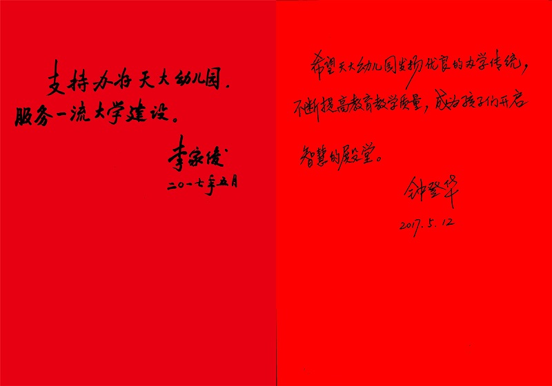 本站讯(通讯员 董奕杉 许湧尧)今年六一国际儿童节,恰逢天津大学幼儿园建园65周年,我校党委书记李家俊欣然题词“支持办好天大幼儿园,服务一流大学建设”。校长钟登华题词“希望天大幼儿园发扬优良的办学传统,不断提高教育教学质量,成为孩子们开启智慧的殿堂。”李家俊书记和钟登华校长的题词及慰问给幼儿园乃至小幼医全体教职工注入了极大动力,全体小幼医人深深感受到了学校党委对服务保障部门的关心、重视和殷切期望,纷纷表示将不负领导重托和全校师生期待,努力建设与一流大学相匹配的师生满意小幼医。