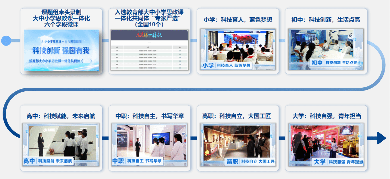 三是充分利用学院签约的25家实践教学基地和64家中小学结对共建平台,将“德法小课堂”延伸到“社会大课堂”,实现了教学环境的持续拓展。课程组牵头录制的《科技创新 强国有我》6个学段微课,入选教育部大中小学思政课一体化共同体“专家严选”,全国只有10个,赋能全国大中小学思政课教师讲好科技强国的故事。