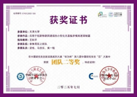 天津大学微电子学院互联感知集成电路与系统团队的梁栋、马宗乐和黄一铭三位同学以题为“应用于短距物联网通信的小型化无晶振多模高速调制器”的作品,获得大赛全国二等奖,团队的指导老师为:王科平教授。