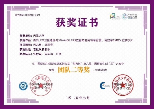 天津大学微电子学院互联感知集成电路与系统团队的张怡婷、朱能旭和叶海三位同学以题为“面向LEO卫星通信与5G-A/6G FR3微基站的高功率密度、高效率CMOS 功放芯片”的作品,获得大赛全国二等奖,团队的指导老师为:孟凡易教授和马凯学教授。