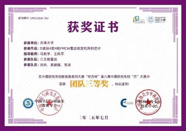天津大学微电子学院互联感知集成电路与系统团队的刘兵、黄建程和张津三位同学以题为“D波段4发4收FMCW雷达收发机阵列芯片”的作品,获得大赛全国三等奖,团队的指导老师为:马凯学教授和王科平教授。