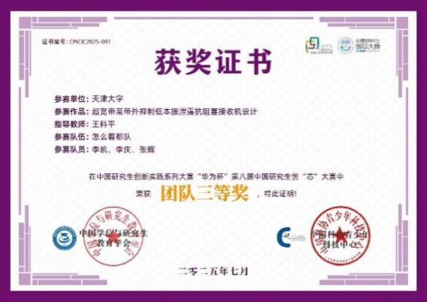 天津大学微电子学院互联感知集成电路与系统团队的李凯、李庆和张辉三位同学以题为“超宽带高带外抑制低本振泄露抗阻塞接收机设计”的作品,获得大赛全国三等奖,团队的指导老师为:王科平教授。