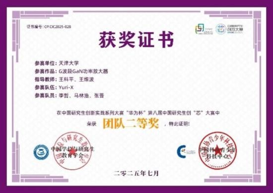 天津大学微电子学院互联感知集成电路与系统团队的李哲和马林浩,以及中国电子科技集团第五十五研究所的张晋三位同学以题为“G波段GaN功率放大器”的作品,获得大赛全国二等奖,团队的指导老师为:王科平教授和王维波研究员。