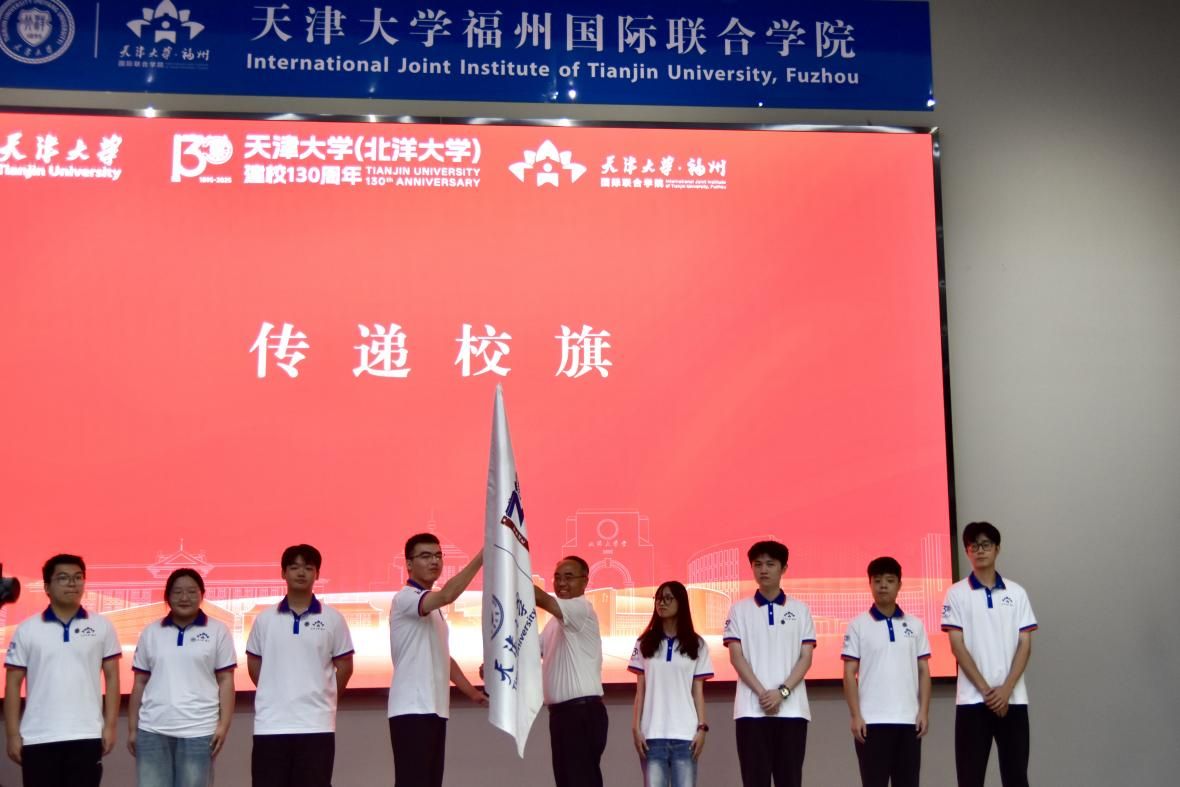 随后,胡文平向新生代表授予校旗。旗帜飘扬,传承的是百卅天大的精神薪火,开启的是新天福人的奋斗征程。