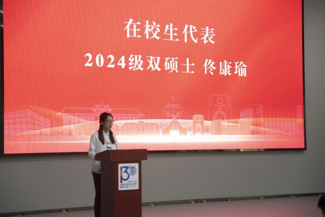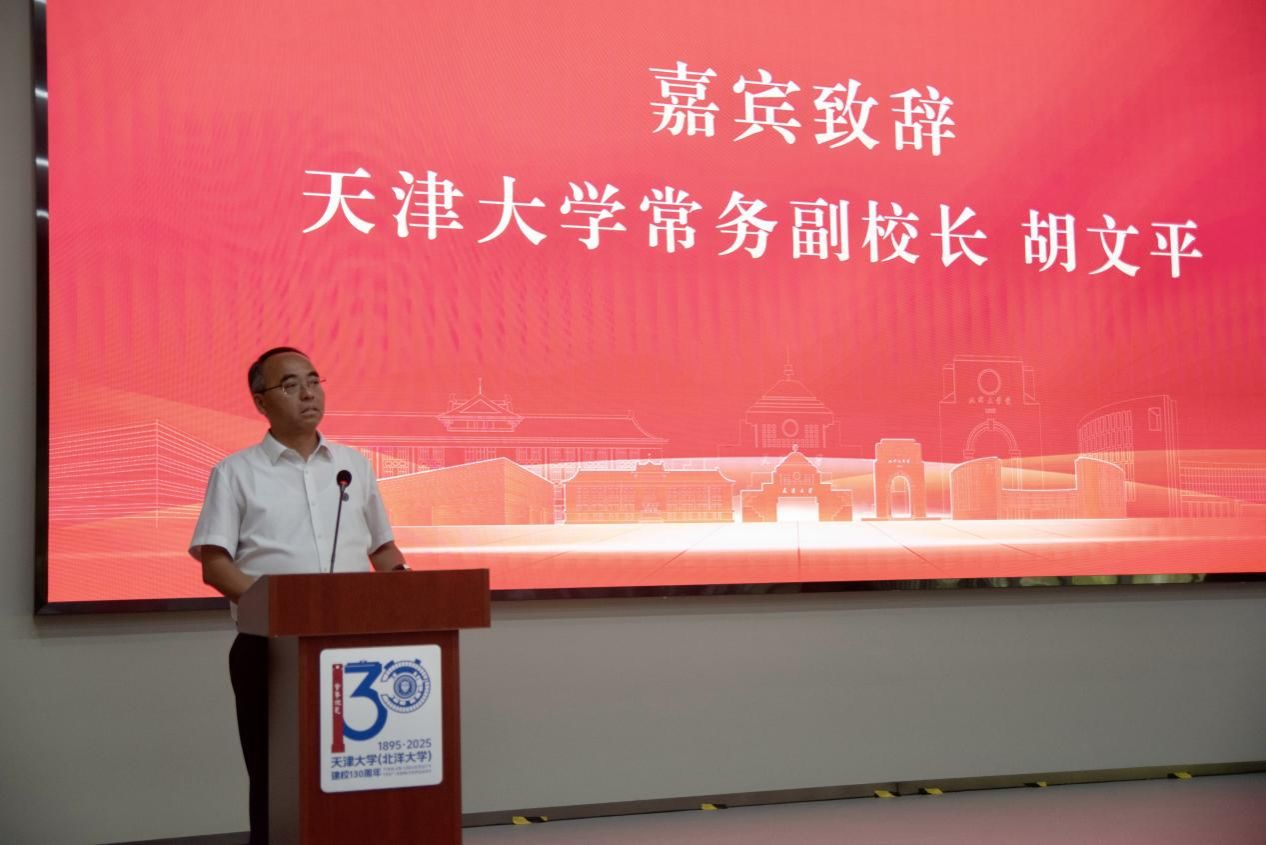 天津大学党委常委、常务副校长胡文平在致辞中回顾了百卅天大的办学历程,阐释了由“兴学强国”的使命、“实事求是”的校训、“严谨治学”的校风、“爱国奉献”的传统和“矢志创新”的追求组成的天大品格。