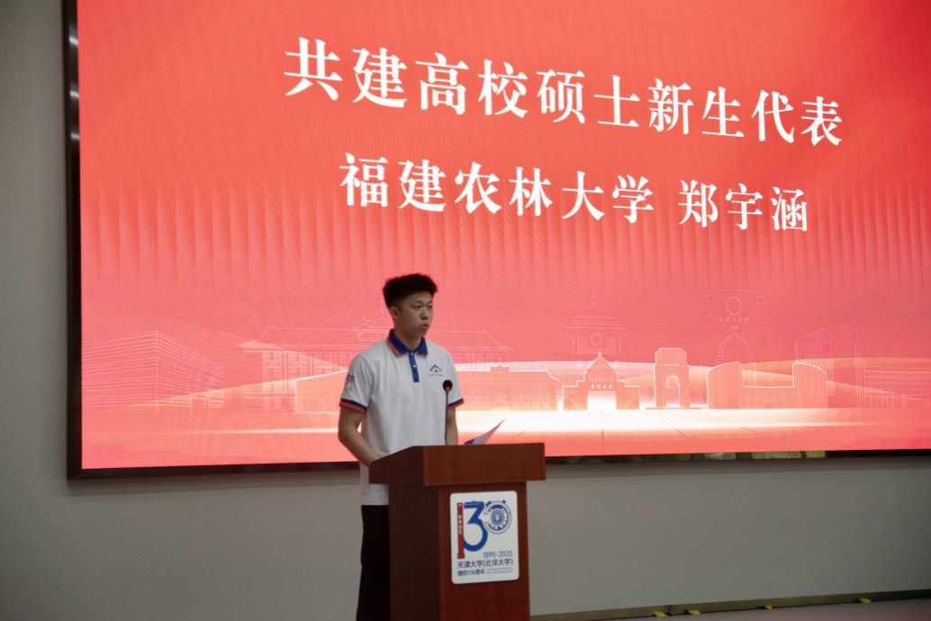 2024级双硕士生佟康瑜以“熵减”为喻,鼓励大家打破思维定式,主动与外界交流,勇敢面对挑战;2025级硕士新生郑宇涵从生活细节切入,分享在福州学院的温暖体验,传递出扎根有福之州、共筑美好未来的真挚情感;2025级工程博士吴鸿飞则结合自身实践经历,呼吁大家“把论文写在祖国大地上”,以技术创新回应时代“卡脖子”难题。