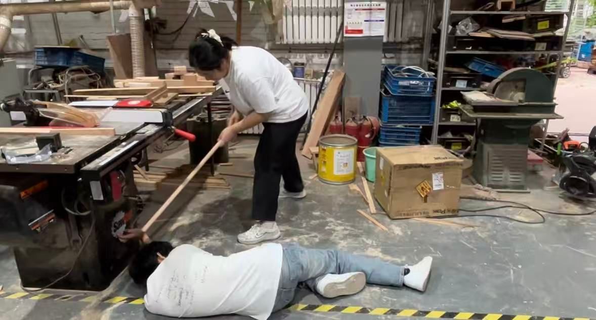 本次主题安全教育活动共包括智能设计与建造实验室应急演练、可变空间与环境实验舱应急演练、消防安全疏散演习、火灾扑救演练、应急救援知识讲座五部分。上午10:00,智能设计与建造实验室在西苑1号楼开展应急演练,重点围绕触电、机械损伤等实验室常见安全风险,遗产保护实验室、声学实验室、光学实验室及建筑热湿环境实验室组织师生代表参加。演练过程中,学生志愿者分别模拟“触电倒地”“机械操作受伤” 等场景,分别按照规范流程依次实操应急处置。