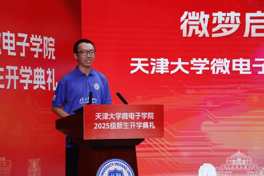 2023级硕士生第一党支部书记王礼泽作为在校生代表进行了发言。王礼泽分享了自己在天大6年的学习与成长经历,结合担任国旗护卫队成员、学生党支部书记的经历,以及参与国家重点研发项目的科研实践,鼓励新生将个人奋斗与民族复兴同频共振,在科研中勇于突破,在产业实践中找准方向,为国产芯片突围贡献力量。
