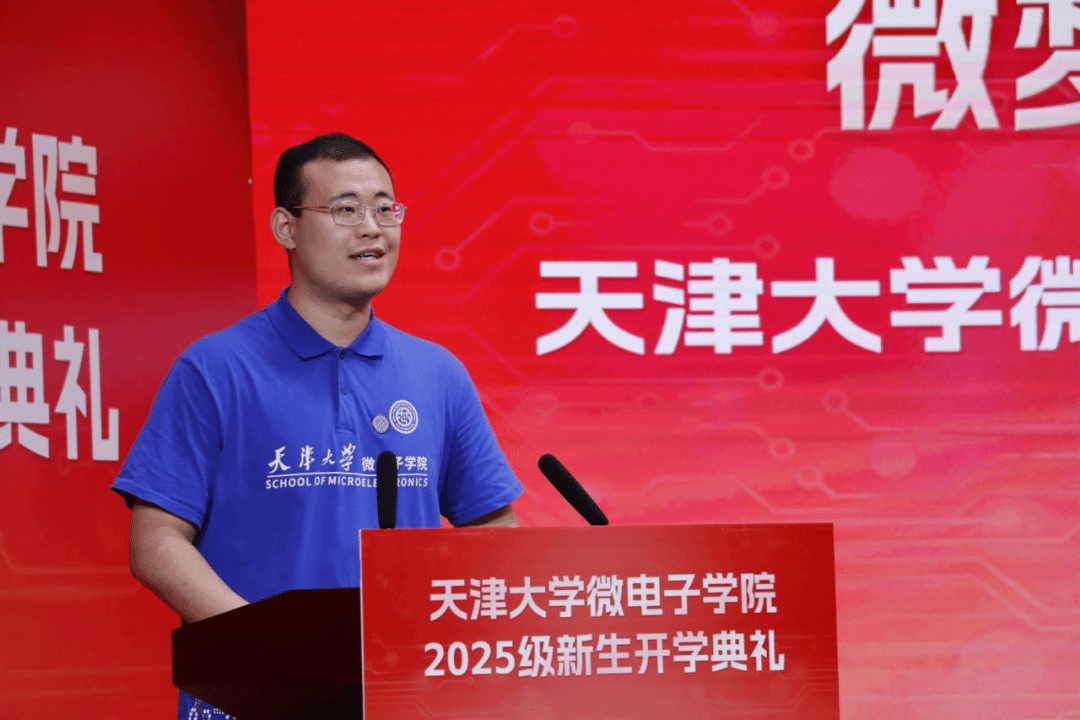 微电子学院教授、博士生导师、国家级领军人才、教师代表徐江涛进行了发言,表达了对新生的深切关怀和期望。希望同学们既要学好书本知识,又要具备全球视野与创新能力,积极参与实践竞赛与科研项目,致力于做出具有国际影响力的原创成果,鼓励同学们将个人理想与祖国前途、民族命运紧密结合,树立强芯强国的远大志向。他表示,作为老师,将恪守天津大学师德规范,做学生追梦路上的守护者,助力同学们成长为微电子领域的专业人才。