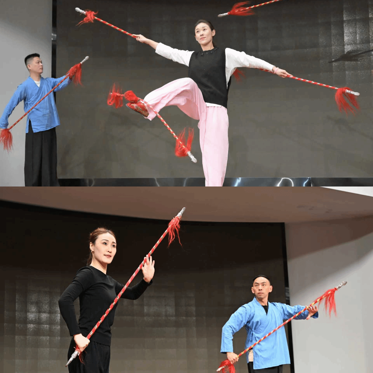 演出伊始,天津京剧院的演员老师率先展示了精彩的“把子功”。刀枪剑戟在舞台上翻飞起舞,铿锵碰撞声中,一招一式既展现惊心动魄的激烈,又饱含舞蹈般的美感与韵律。这场“真功夫”的预热,让现场观众直观感受到京剧武戏“稳、准、狠、美”的程式魅力,更对即将开演的《闹龙宫》充满期待。