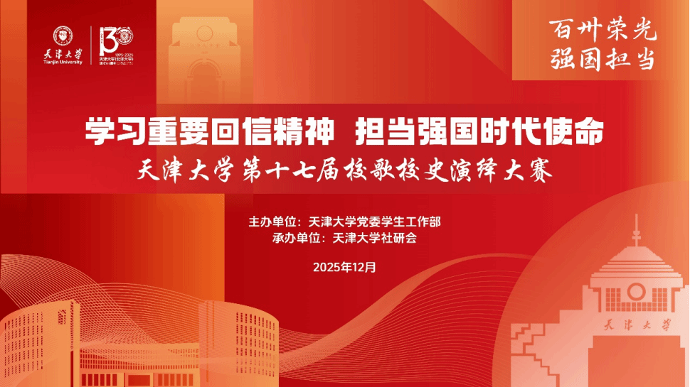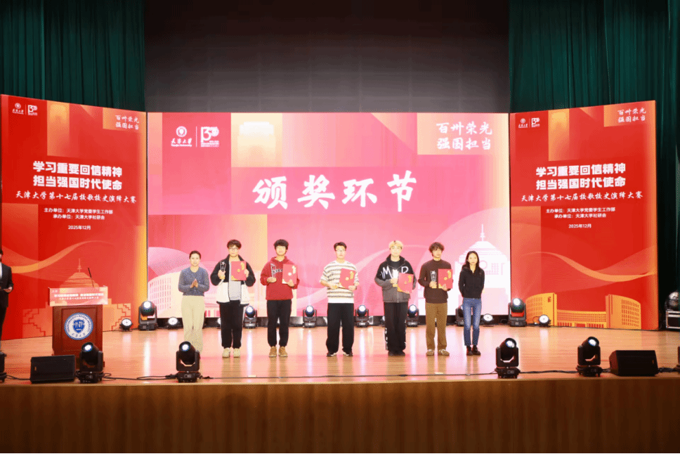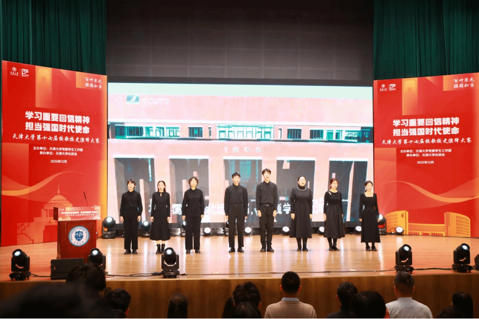 为深入学习贯彻习近平总书记给天津大学全体师生的重要回信精神,将“兴学强国”的家国情怀与殷殷嘱托转化为青年担当,2025年12月6日,由天津大学党委学生工作部主办、天津大学社研会承办的“学习重要回信精神 担当强国时代使命”天津大学第十七届校歌校史演绎大赛在北洋园校区国家大型地震工程模拟研究设施仿真中心茅以升报告厅成功举办,学工部副部长潘刚老师、马克思主义学院副院长李伟老师、机关党委王玉老师、教务处王睿老师、图书馆赵红老师、档案馆曹海燕老师、艺术教育中心郝音老师、学工部赵铭老师出席活动并担任现场评委。