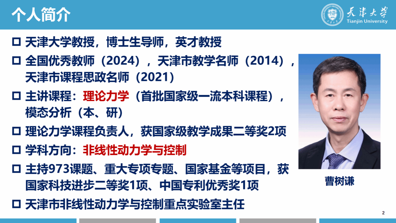 曹树谦教授为天津大学英才教授、博士生导师、全国优秀教师、天津市教学名师,长期主讲《理论力学》等课程,并主持多项国家级教学与科研项目。在课程中,他围绕“教师的使命与责任”“课程思政是教育的灵魂”“我的课程育人实践”等模块展开,强调教育应坚持立德树人根本任务,并指出“课程思政是教育教学的‘画龙点睛’之笔”。