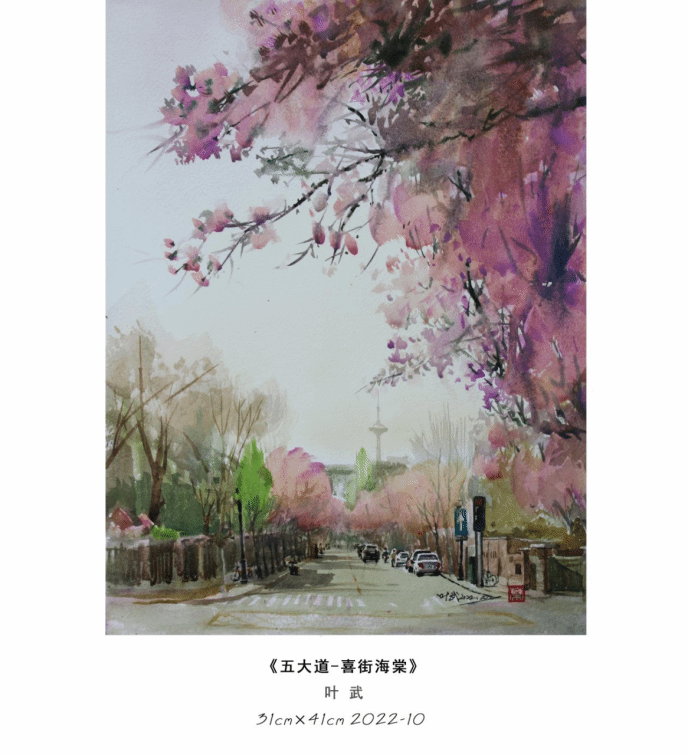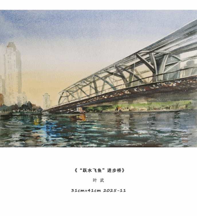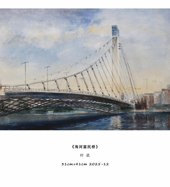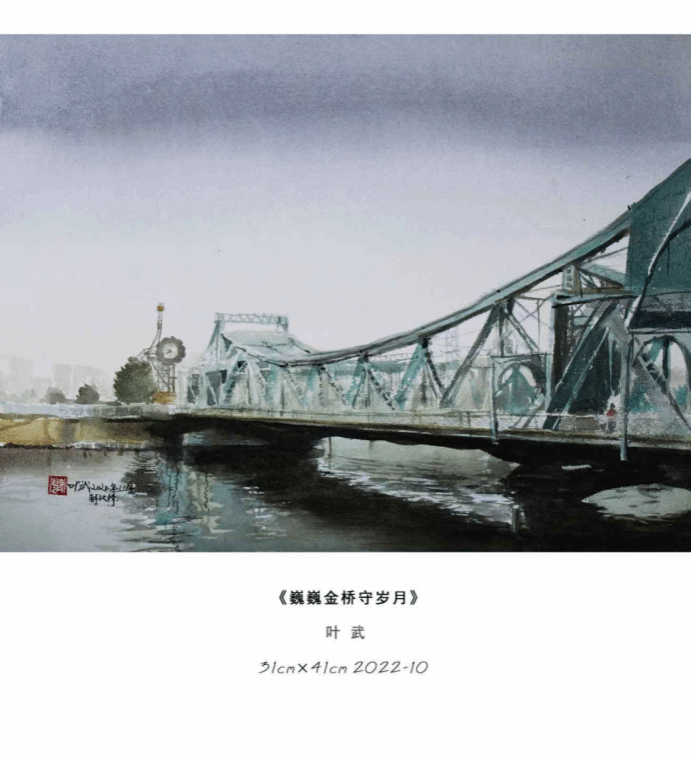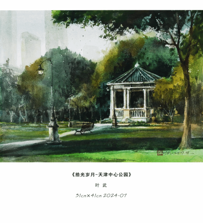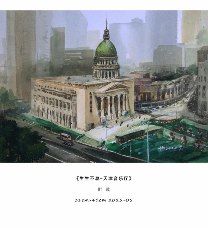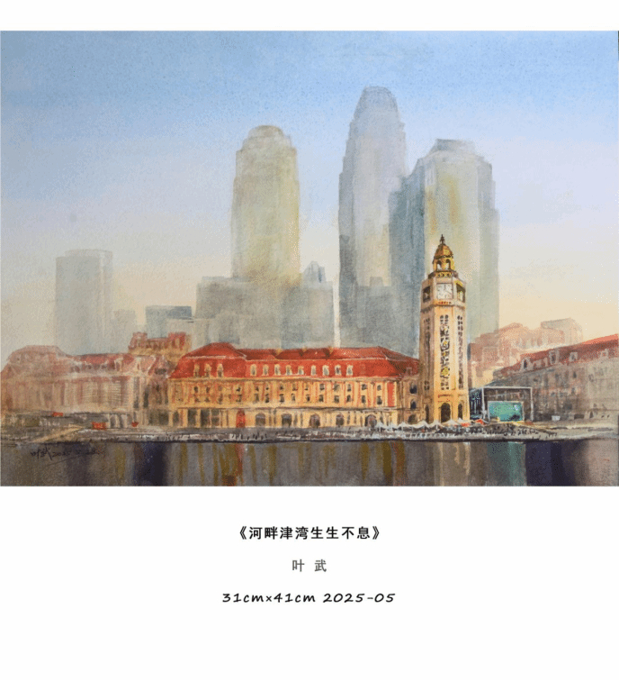 本次展览叶武以「天津城市印象」为核心,自去年9月在“都市报道60分”电视播出上合峰会让天津举世瞩目水彩作品描绘城市之美的报道后,又带来了津门本土题材的水彩精品力作。在这里,观众看见的不只是一幅幅水彩作品,更是一座城的过往与今朝,是藏在烟火里的浪漫,是融在风骨中的底蕴。