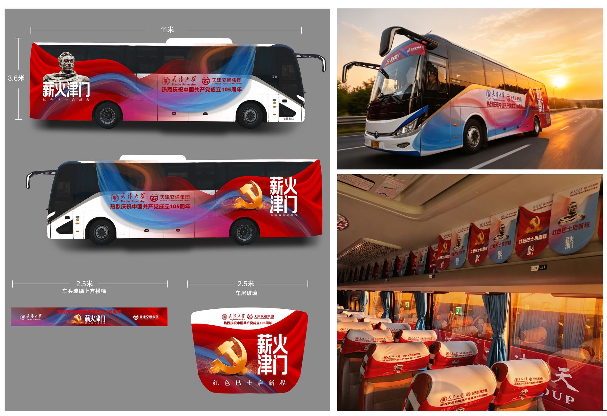 “薪火津门105·红色巴士启新程”项目是天津大学人文艺术学院与天津市交通集团深化校企合作、协同育人的重要成果。项目以“薪火津门”致敬津沽大地的红色根脉,以“105”点明庆祝建党105周年核心主题,以“红色巴士启新程”寓意从历史走向未来、在新时代接续奋斗。双方分工明确、优势互补:天津大学人文艺术学院负责项目整体策划、内容研发、路线设计与创意制作,将学术资源与育人理念转化为可感可触的移动课堂;天津市交通集团提供巴士车辆与司机服务保障,为项目的落地运行提供坚实支撑。校企双方协同构建起一个以“红色育人”为内核、以“移动的课堂”为功能、以“流动的红色博物馆”为形态的创新性红色文化传播平台。