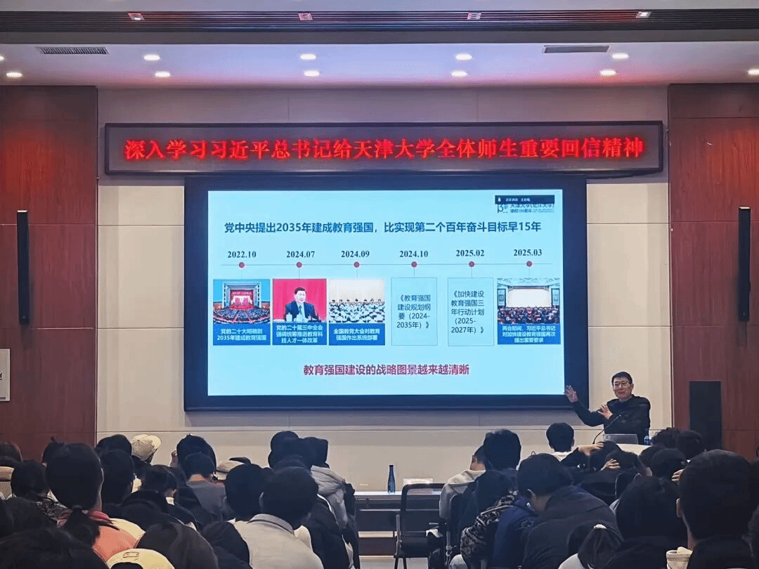 明东以党的二十届四中全会和“十五五”规划为切入点,深刻阐述了加快高水平科技自立自强、引领发展新质生产力对于推进中国式现代化的重要意义。他深入剖析了“十五五”规划的思想内涵及核心要求,详细讲解了教育强国建设的内涵特征、实践路径以及高等教育的发展方向,使同学们深刻理解天津大学必须肩负起“自强卓越”的历史重任。