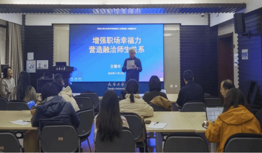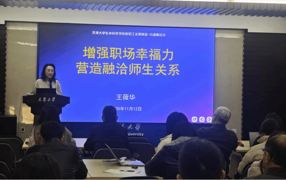 本站讯 为深入学习贯彻习近平总书记给天津大学全体师生重要回信精神,进一步建强研究生导师队伍,持续提升导师育人能力,不断提高研究生人才培养质量,2025年11月12日,天津大学生命科学学院组织开展了“教职工赋能计划——沟通协作赋能·沟通酶促坊项目”。特邀积极心理学专家王薇华老师作《增强职场幸福力,营造融洽师生关系》专题讲座。本次活动由王涛副院长主持,医学院孟琳副院长及药物科学与技术学院穆昕副院长应邀参加。