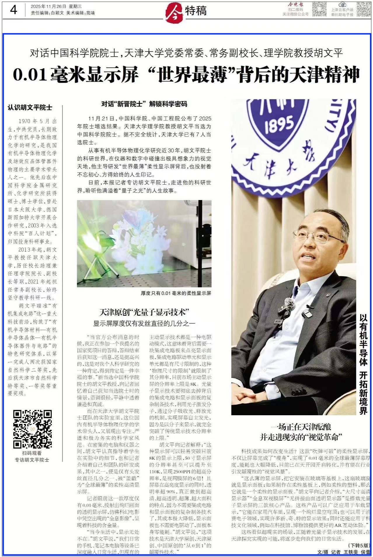 而在天津大学胡文平院士团队的实验室里,这位国内有机半导体物理化学的学术带头人,又展现出专注、严谨和极为务实的科学家风范。在密集的电脑和仪器之间,胡文平认真指导着学生在实验中的细节,也和记者介绍着自己和团队的研发成果,其中之一,便是仅有头发丝直径几分之一、被“盖戳”为“全球最薄”的柔性高清显示屏。